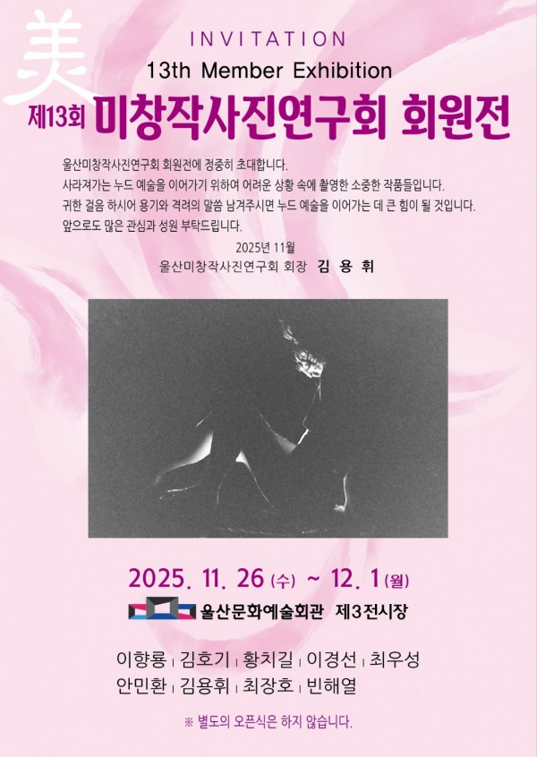 제13회 미창작사진연구회 회원전 작성자 정보 운영자 작성 작성일 2025.11.17 18:40 컨텐츠 정보 18 조회 목록 본문 제13회 미창작사진연구회 회원전♤전시기간 : 2025년11월26일(수)~12월01일(월)♤전시장소 : 울산문화예술회관 제3전시장 관련자료 다음 중문포토웍스 사진전 11th 작성일 2025.11.13 12:46 댓글 0 등록된 댓글이 없습니다. 로그인한 회원만 댓글 등록이 가능합니다. 목록