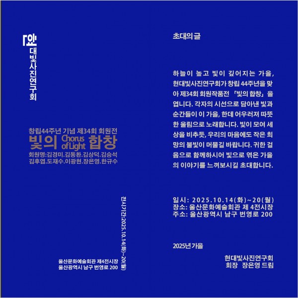 현대빛사진연구회 창립44주년 제34회 회원전 [빛의 합창] 작성자 정보 운영자 작성 작성일 2025.10.11 16:23 컨텐츠 정보 281 조회 목록 본문 현대빛사진연구회창립44주년 제34회 회원전[빛의 합창]전시기간:2025. 10. 14(화)~20(월)전시장소:울산문화예술회관 제4전시장참여작가: 장은영. 김동환. 김상덕. 김승석.김후엽. 한규수. 도재수. 깊어가는 가을,빛과 순간으로 담은 각자의 이야기를 전합니다.이번 사진전이 여러분께작은 울림과 여운으로 남기를 바랍니다.귀한 걸음으로 함께해 주시길 바랍니다.※ 별도의 오픈식은 진행하지 않습니다 관련자료 이전 제27회 울산초등사진교육연구회 회원전 작성일 2025.10.27 13:06 다음 제16회 울산빛그림사진연구회 회원전 작성일 2025.10.01 13:05 댓글 0 등록된 댓글이 없습니다. 로그인한 회원만 댓글 등록이 가능합니다. 목록