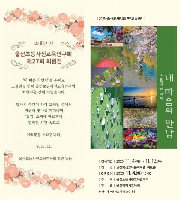 제27회 울산초등사진교육연구회 회원전 작성자 정보 운영자 작성 작성일 2025.10.27 13:06 컨텐츠 정보 197 조회 목록 본문 ●제27회 울산초등사진교육연구회고영상 회원참여-일시:2025년11월4일(화)~11월13일(목)-장소:울산학생교육문화회관 위로홀 관련자료 이전 문화 예술 회관 초청기획 전시(야외조각과 설치작품) 작성일 2025.10.30 13:17 다음 현대빛사진연구회 창립44주년 제34회 회원전 [빛의 합창] 작성일 2025.10.11 16:23 댓글 0 등록된 댓글이 없습니다. 로그인한 회원만 댓글 등록이 가능합니다. 목록