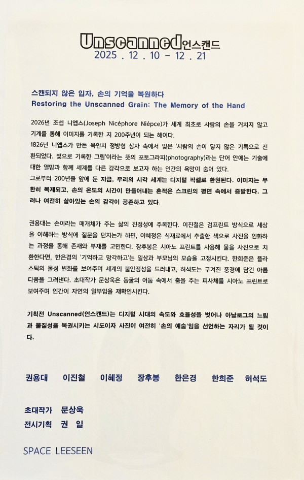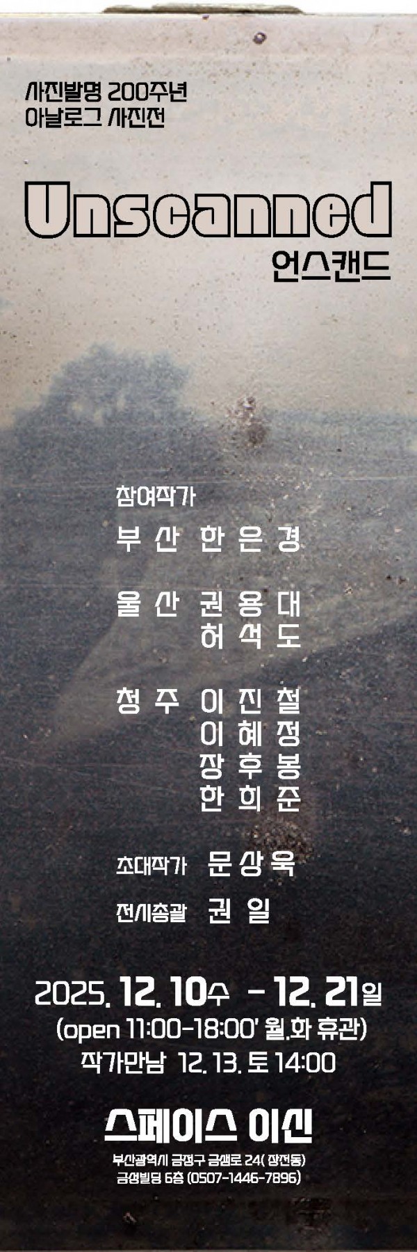 Unscanned(언스캔드)사진전 작성자 정보 운영자 작성 작성일 2025.12.11 15:52 컨텐츠 정보 177 조회 목록 본문 Unscanned(언스캔드)사진전일시 : 2025년 12월 10일(수) ~ 12월 21일(일)장소 : 스페이스 이신(부산 금정구 금샘로 24(장전동)금성빌딩 6층(0507-1446-7896)작가 만남 : 2025년 12월 13일(토) 14:00 관련자료 이전 뉴푼크툼(고래이야기)사진전 작성일 2025.12.20 16:18 다음 제11회 '공간' 사진 동호회 회원전 작성일 2025.12.08 16:48 댓글 0 등록된 댓글이 없습니다. 로그인한 회원만 댓글 등록이 가능합니다. 목록