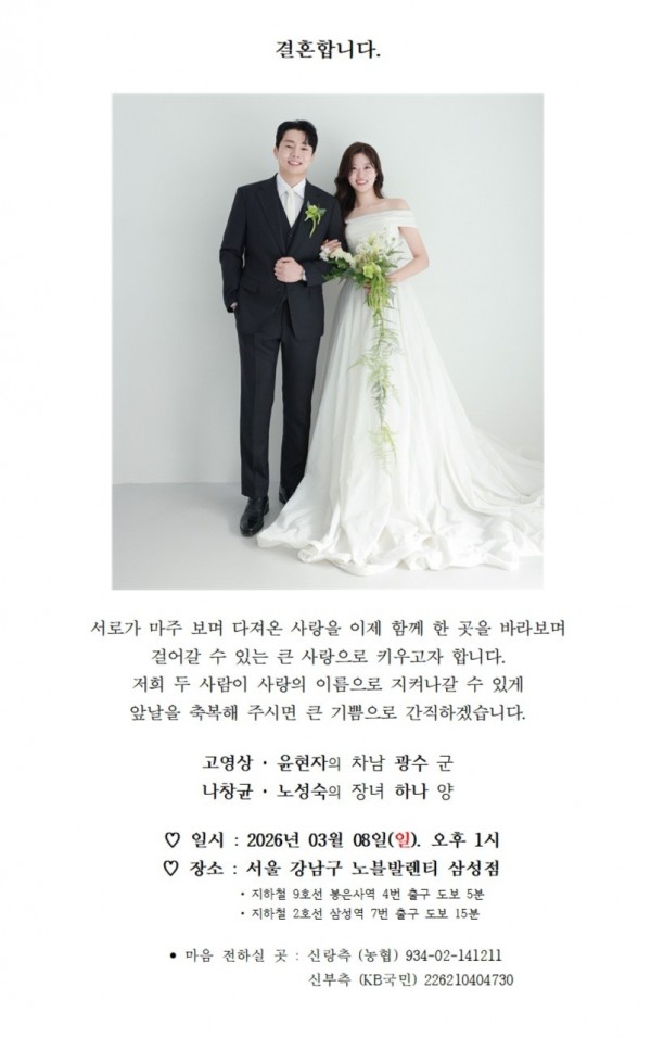 고영상 감사 차남 결혼안내 작성자 정보 운영자 작성 작성일 2026.02.24 08:16 컨텐츠 정보 74 조회 목록 본문 ●고영상회원 차남 결혼안내●♤일시:2026년 3월 8일(일) 오후1시♤장소:서울 강남구 노블 발렌티 삼성점♧마음 전하실곳: 고영상 (농협) 934-02-141211 관련자료 다음 김춘화회원 아들 결혼안내 작성일 2026.02.23 17:15 댓글 0 등록된 댓글이 없습니다. 로그인한 회원만 댓글 등록이 가능합니다. 목록